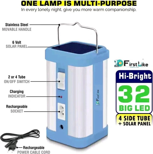 Equipped with dual charging options – solar panel and electric plug-in, it ensures uninterrupted lighting anytime, anywhere. The 4 high-efficiency LED tubes deliver wide coverage with extra brightness, while the high-capacity rechargeable battery offers extended backup during long hours of darkness.